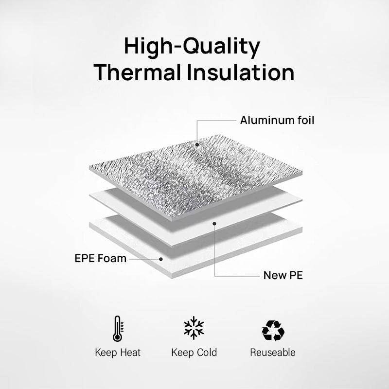 Our insulated shipping bags are made of aluminum film and foam paper. Thin, leak-proof material prevents all forms of heat transfer, resulting in excellent insulation while saving space and money! Durable, lightweight, reusable insulation bag.